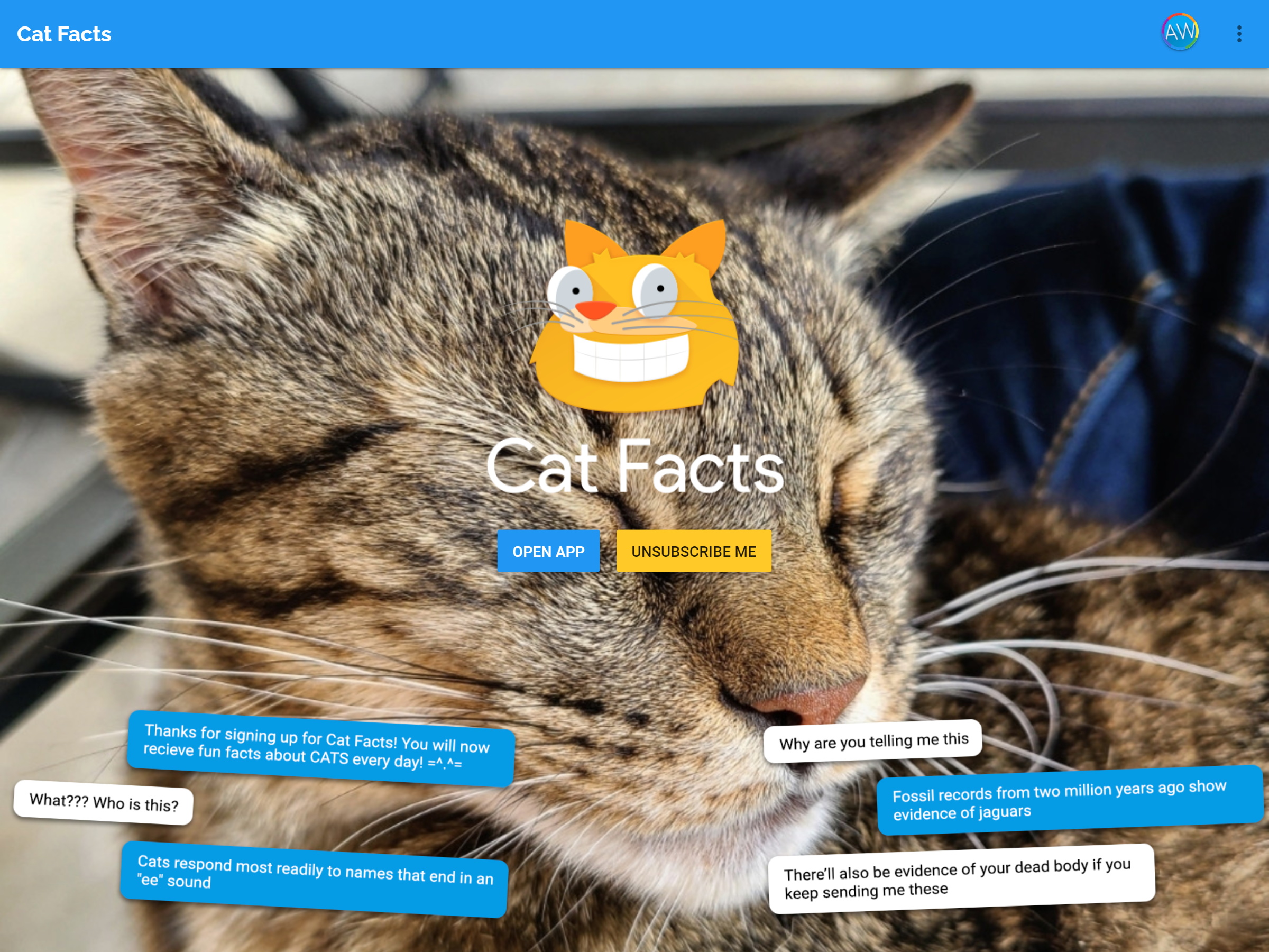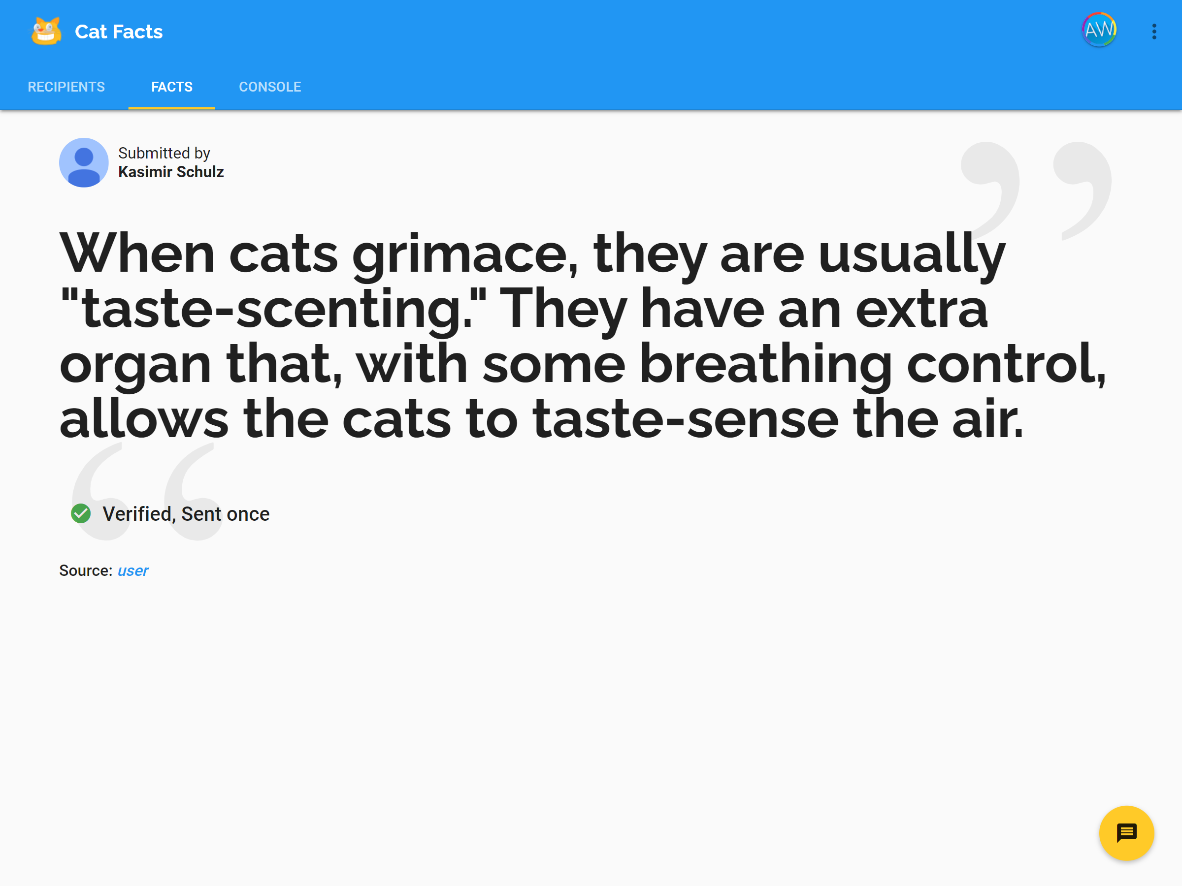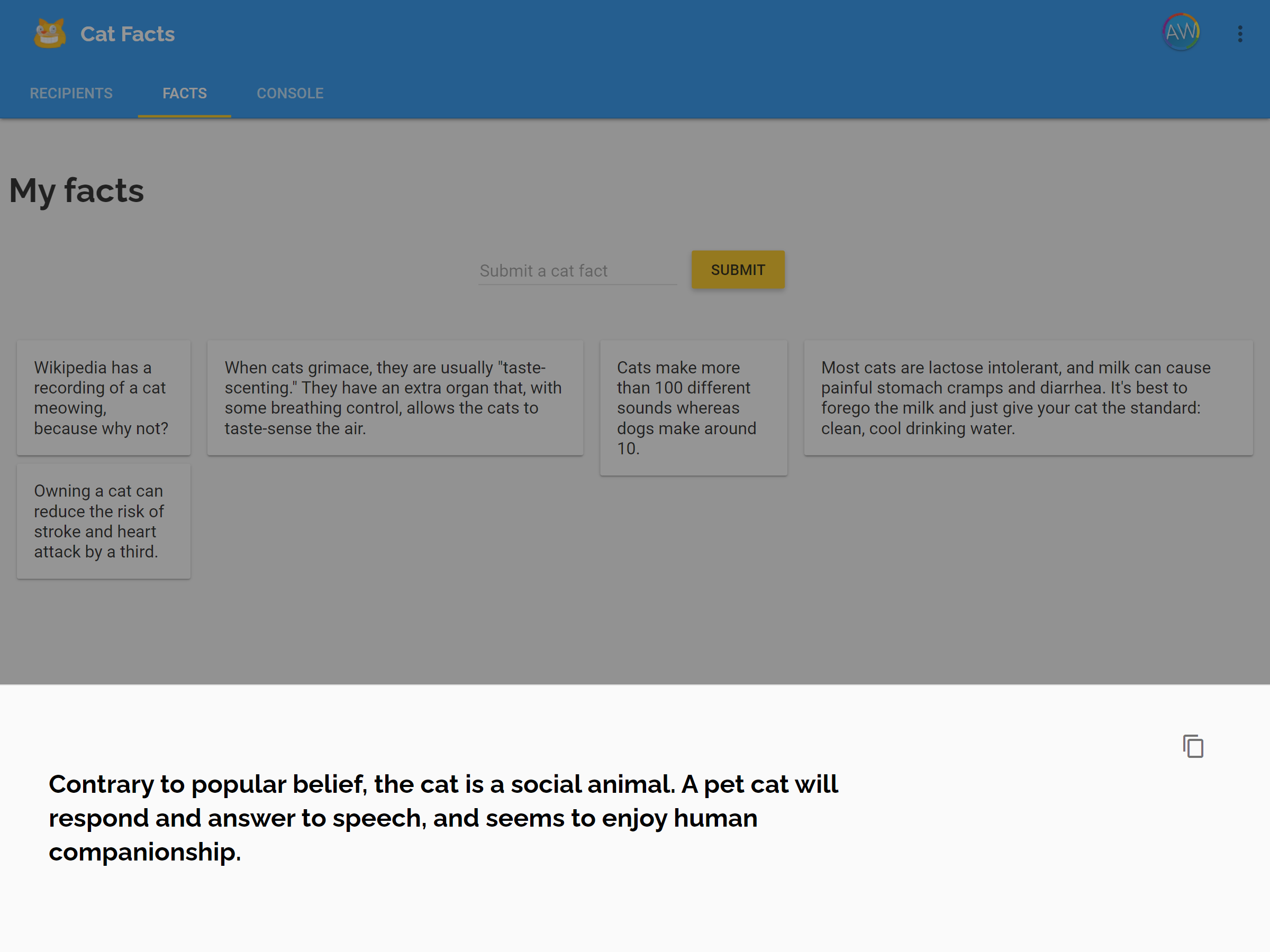 What started out as a fun prank texting friends random cat facts every day, turned into a wide-scale API that people around the world use in their "pet" projects (ha). Here I host a database of facts about cats, dogs, and other animals. Facts are crowdsourced from users and voted on to elect the best facts.