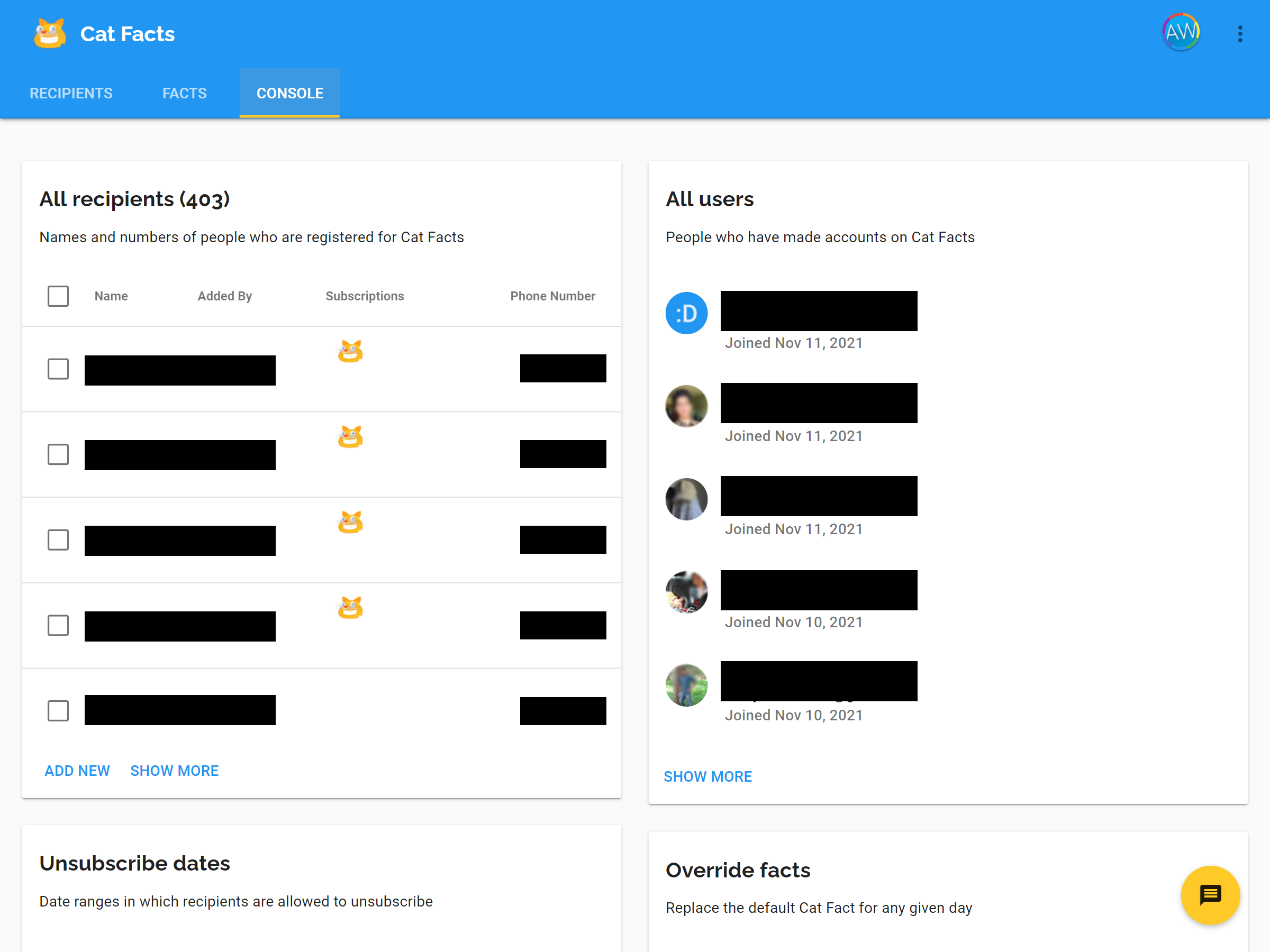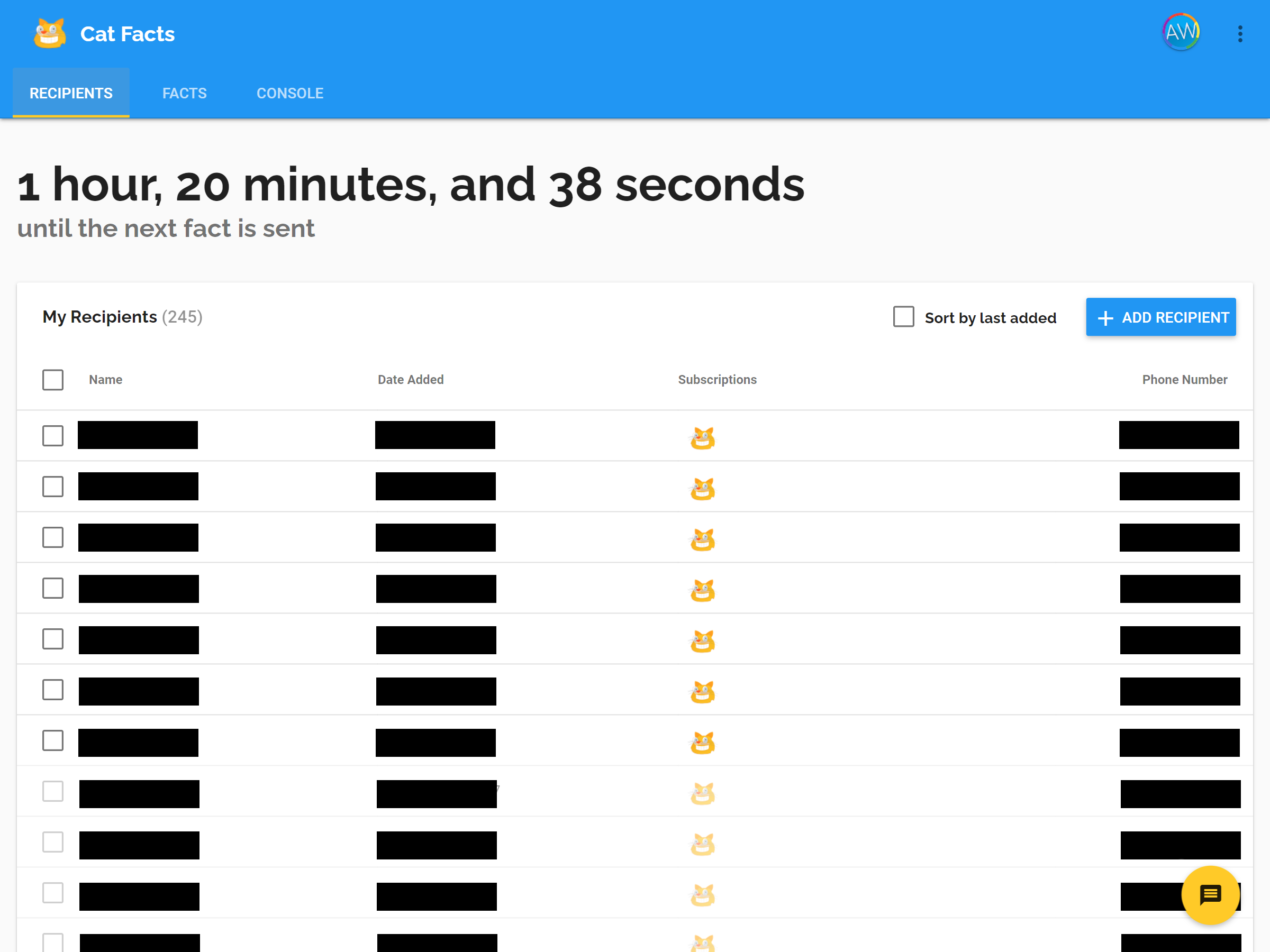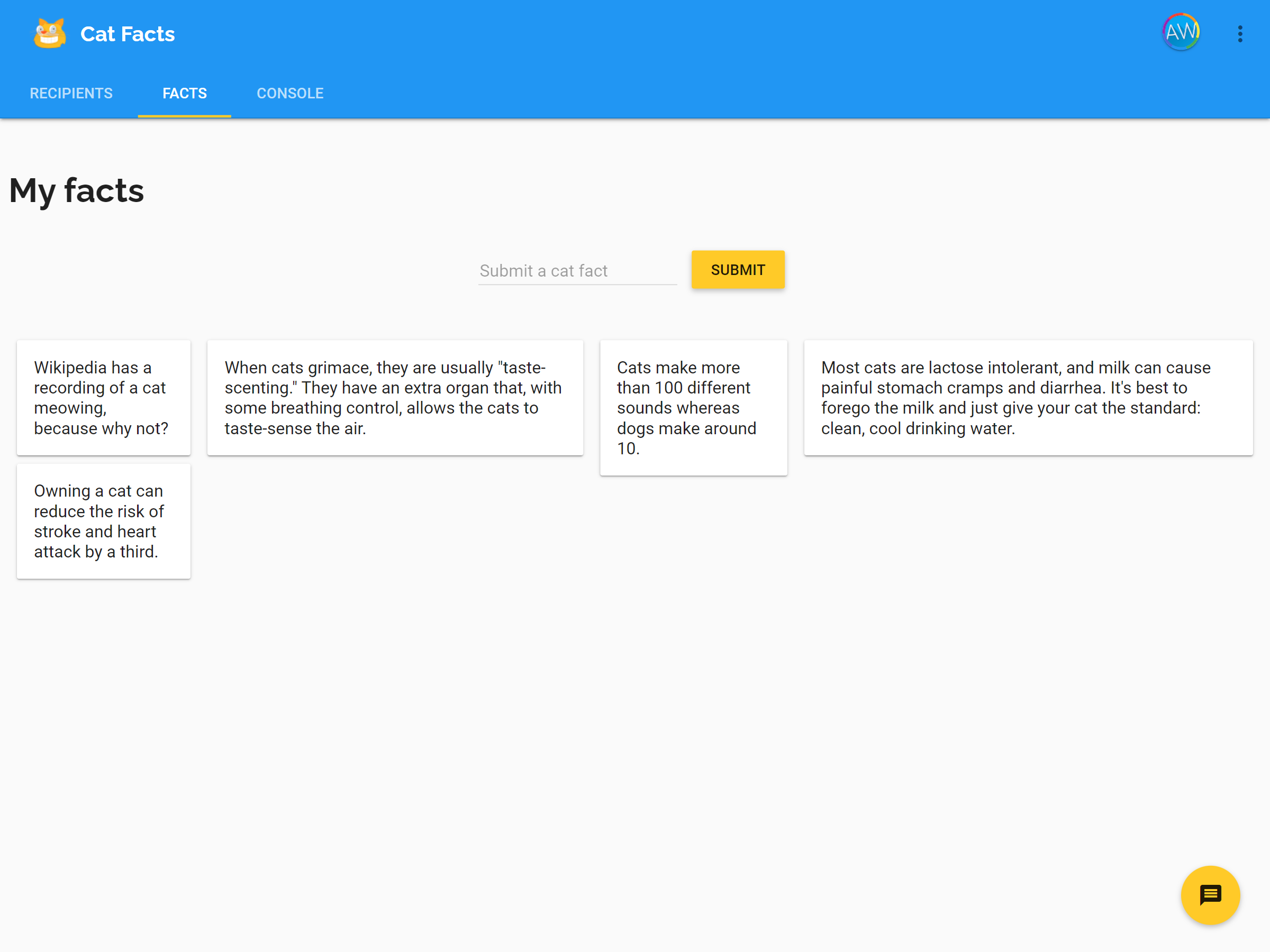What started out as a fun prank texting friends random cat facts every day, turned into a wide-scale API that people around the world use in their "pet" projects (ha). Here I host a database of facts about cats, dogs, and other animals. Facts are crowdsourced from users and voted on to elect the best facts.